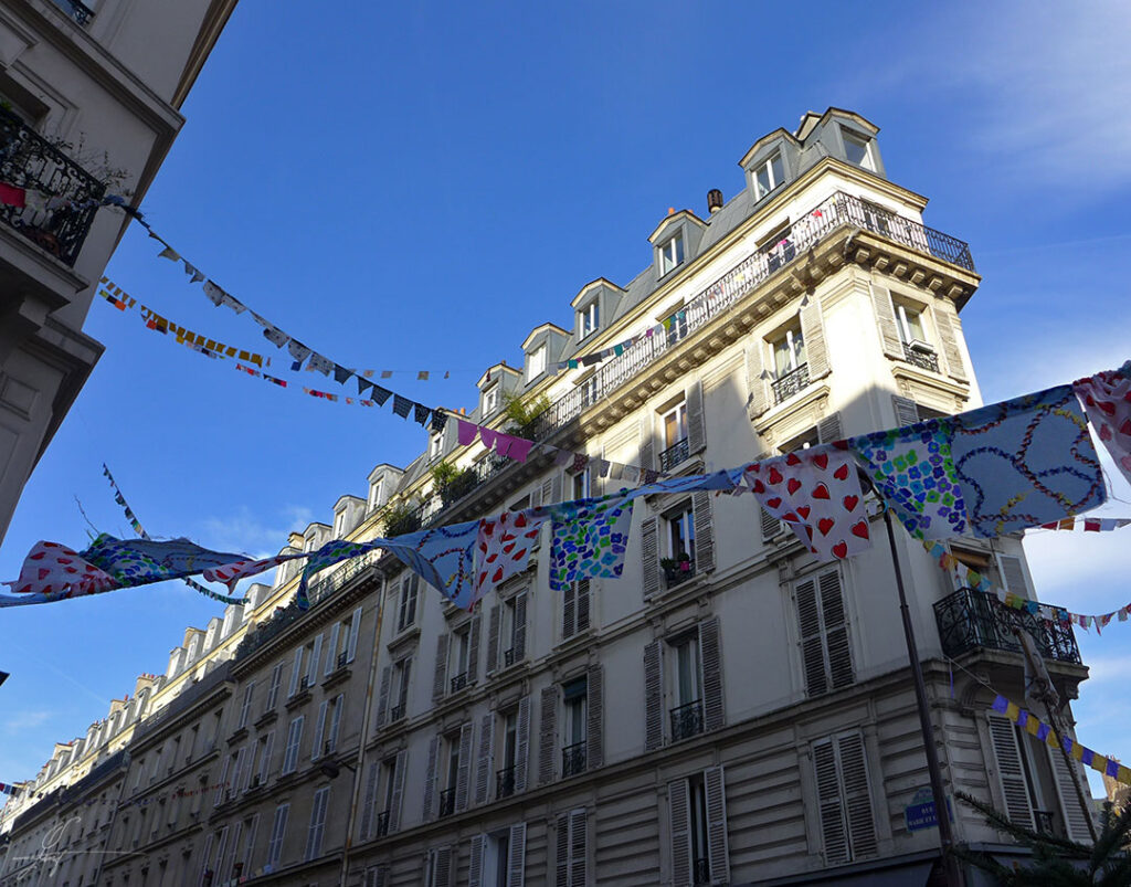 様々な模様の布を 万国旗のようにして街に掲げ、平和を願っています。
